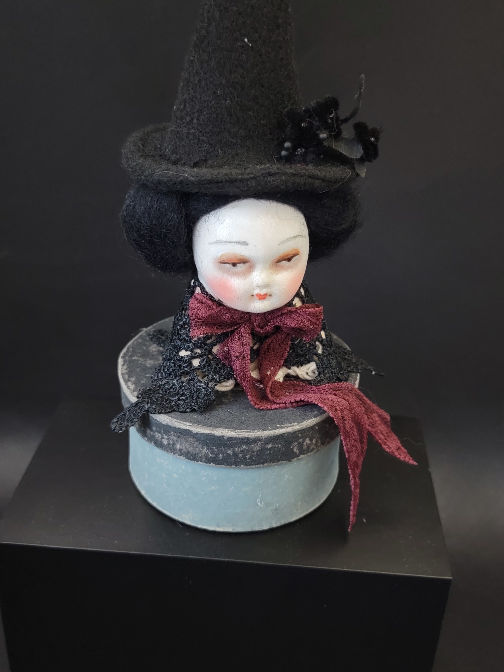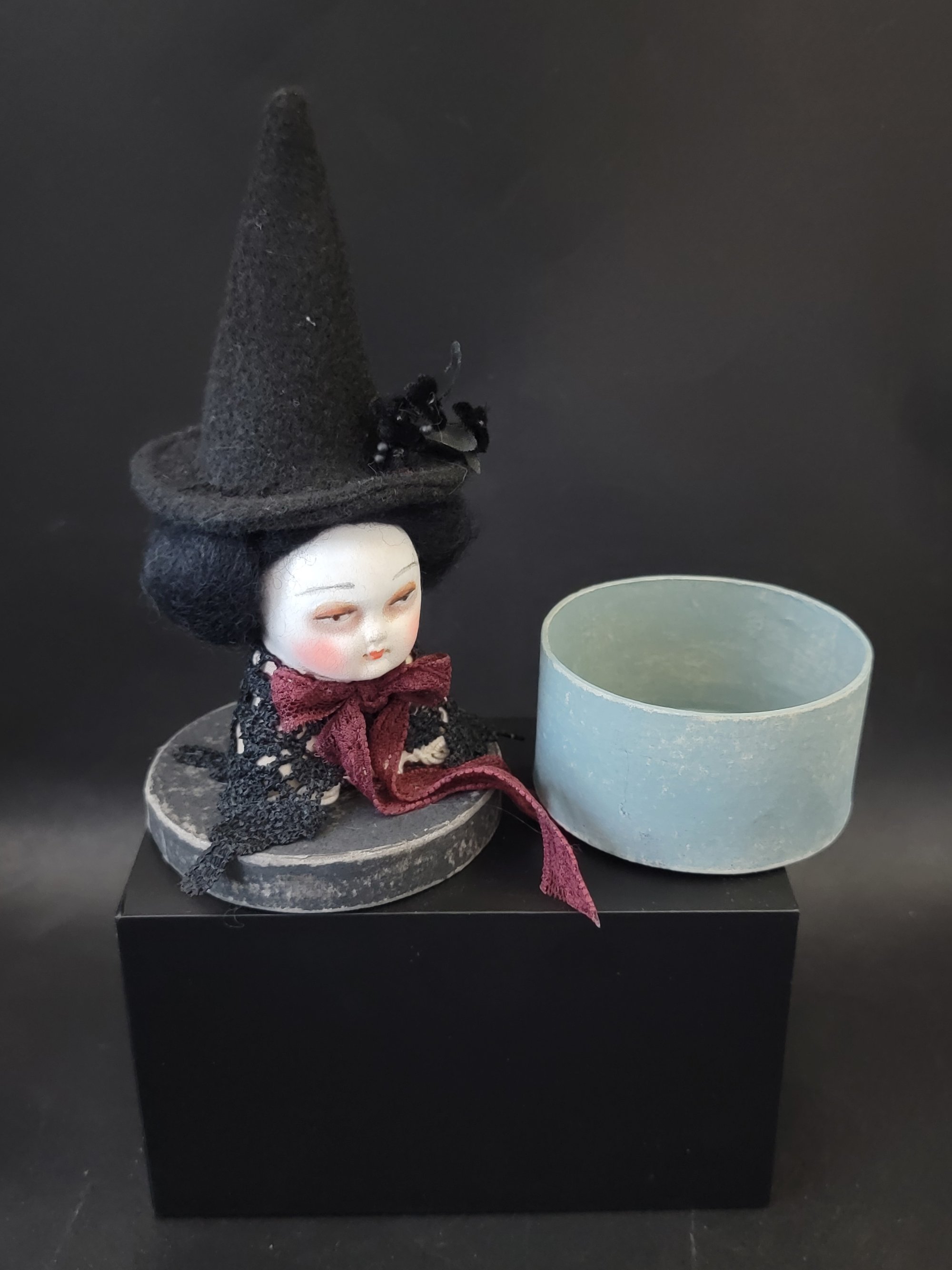 Handmade doll bust candy container. She is 7" high by 3" wide.