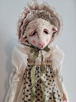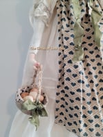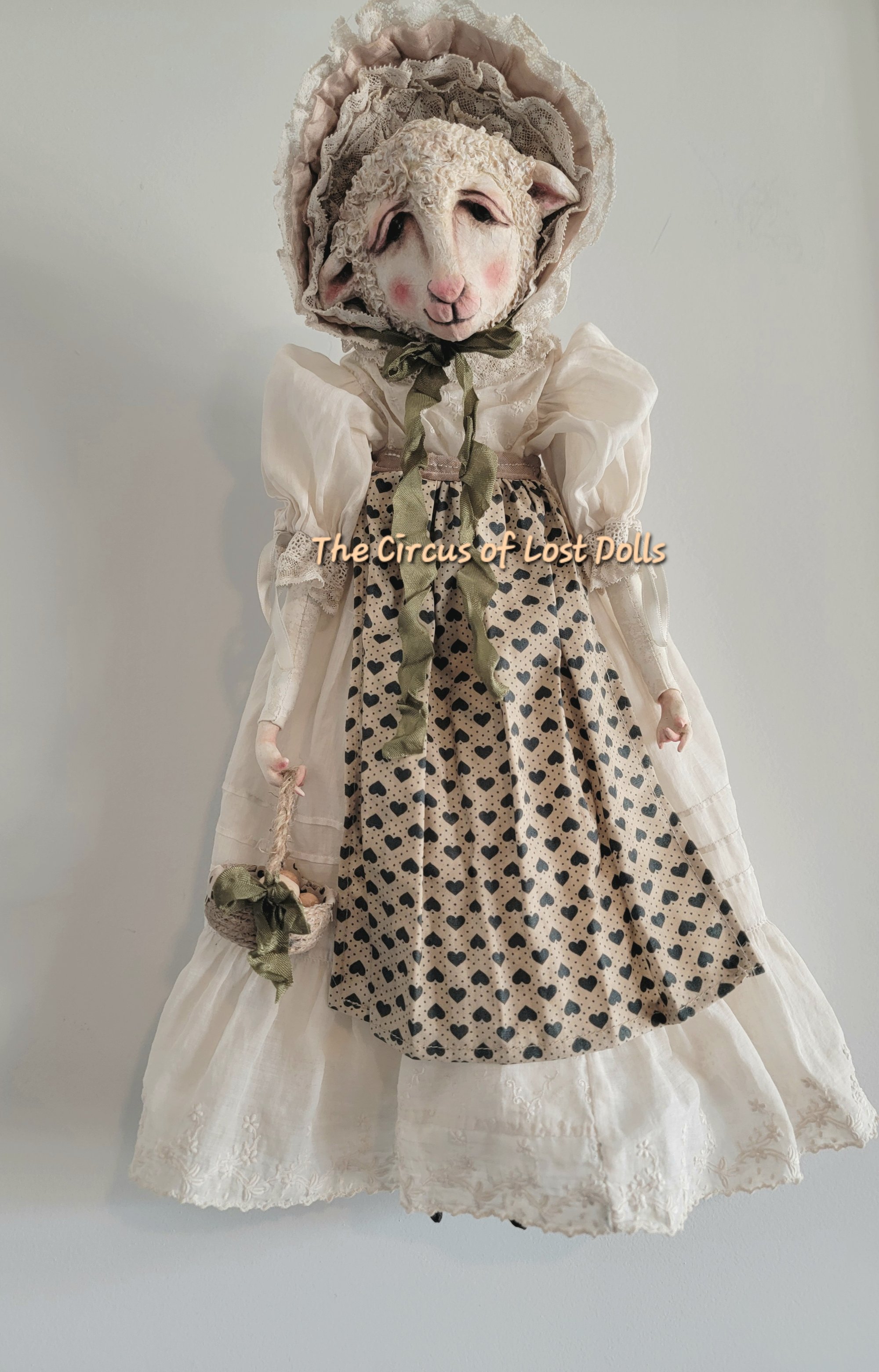 Lola is hand sculpted made of paper clay and paper mache, she is 17" inches taller, her dress is antique, sha has a hook/ string at her back to be hung on the wall. Her apron is made of vintage cotton. She holding an handmade basket with eggs inside. This is a perfect piece to decorate your house for Easter.