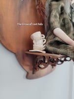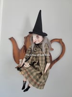 She is sitting on a wooden teapot shiluette stand, she can be removed, and she is not glued down. The teacup is also hand sculpted.