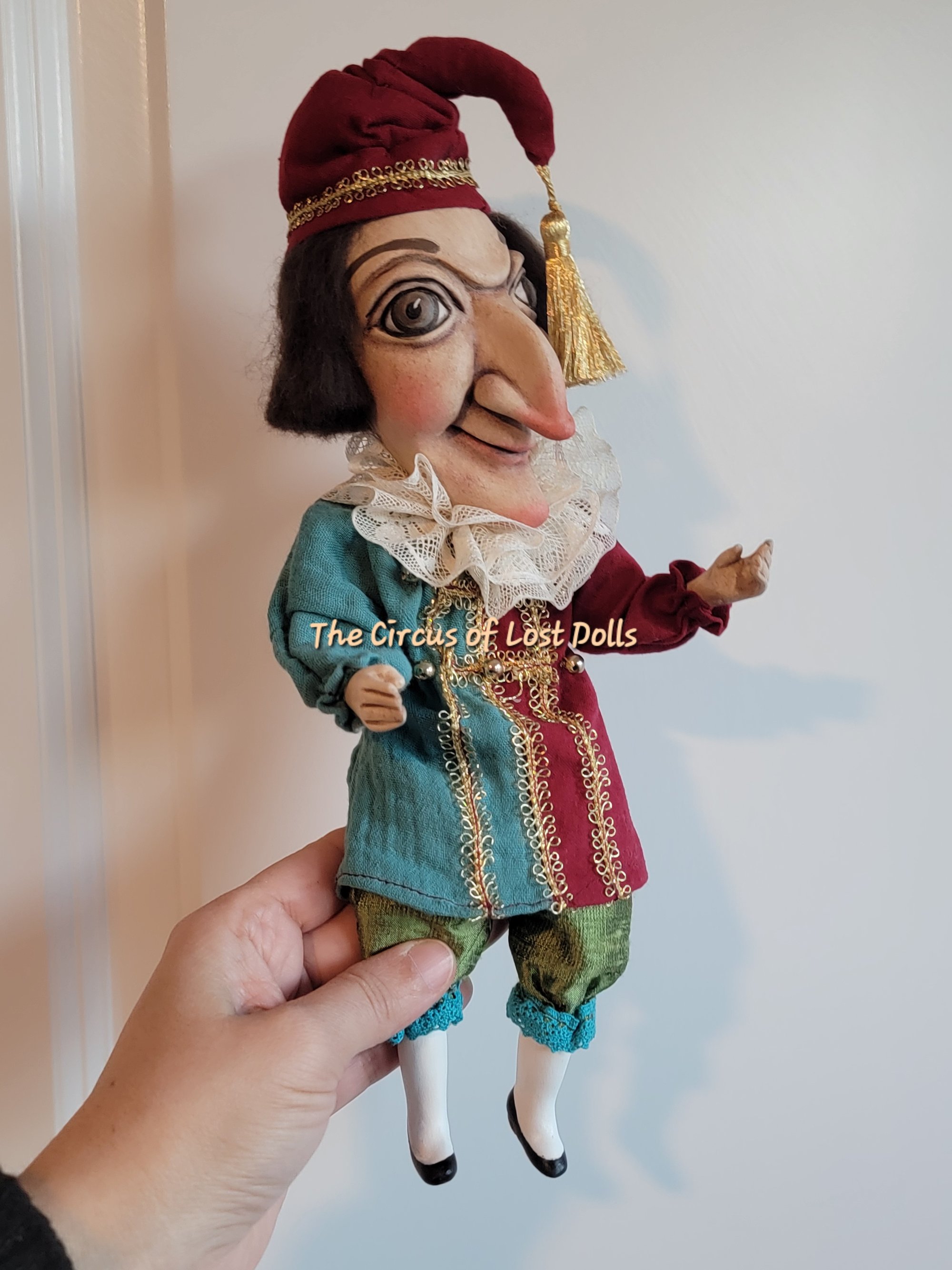 Mr. Punch is 100% handmade, made of paper clay, he has a posable soft body, with a metal armature inside.
