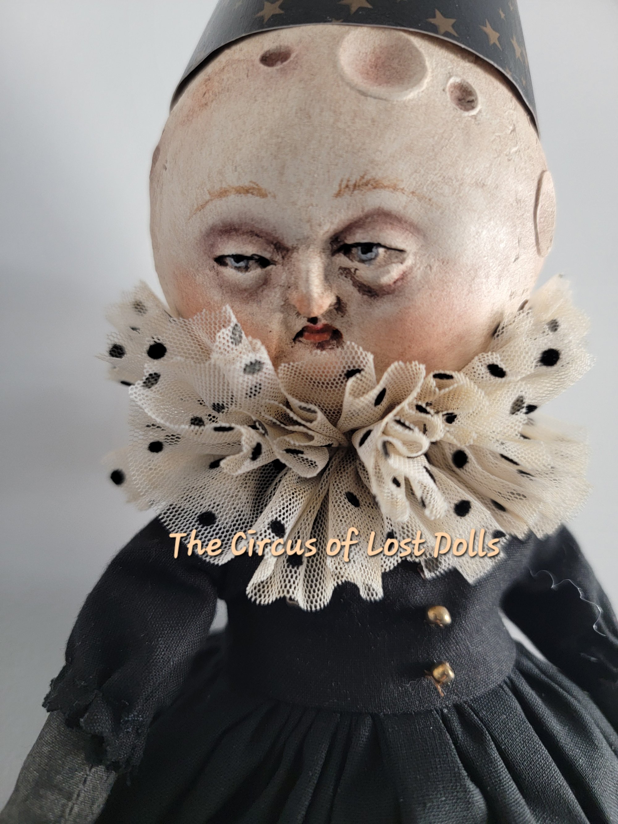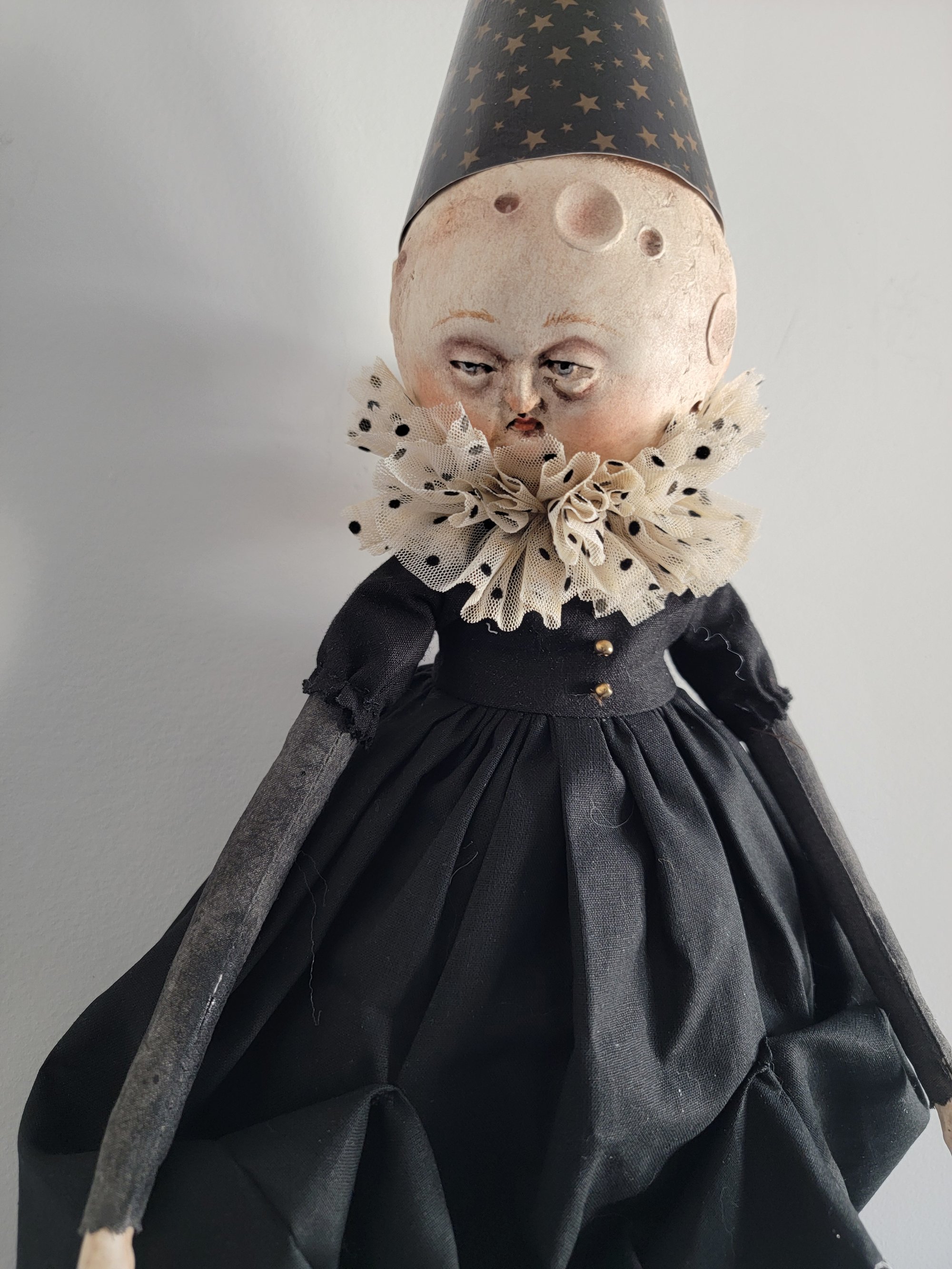 Handmade art doll, her head and hands are made of paper clay, her body is soft sculpted made of fabric, she is 17" inches taller. Sha has a string on the back to hung her on the wall.